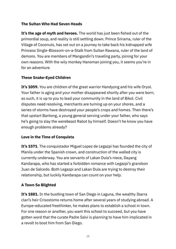 This ttrpg also contains plot hooks, so you can play within the various eras of Philippine history. Some examples are: